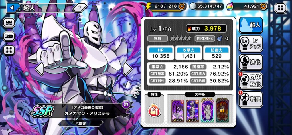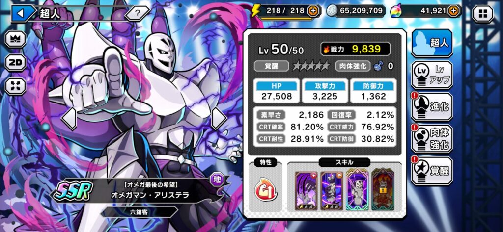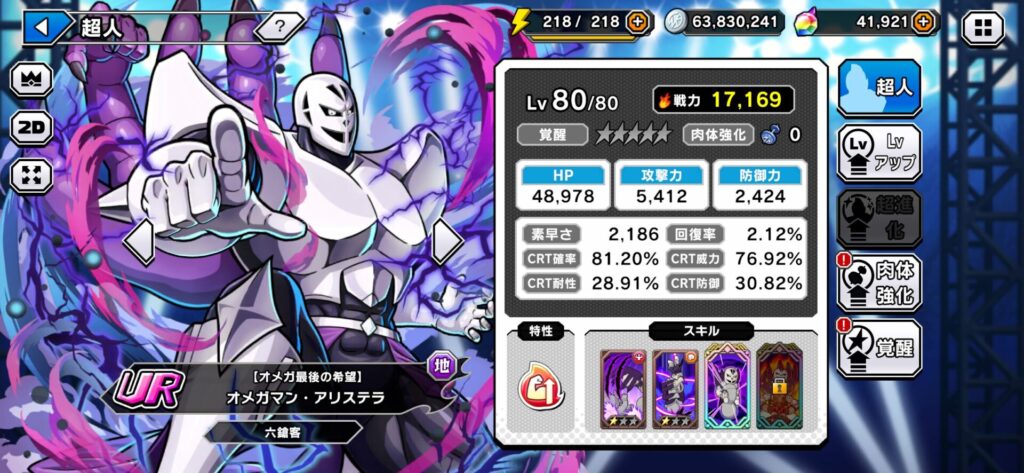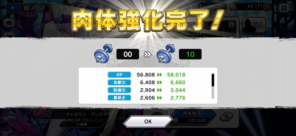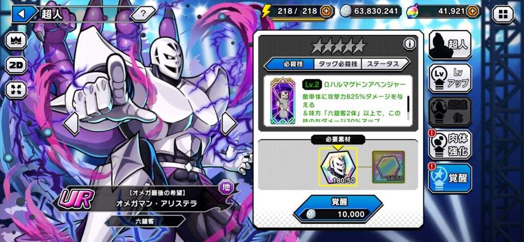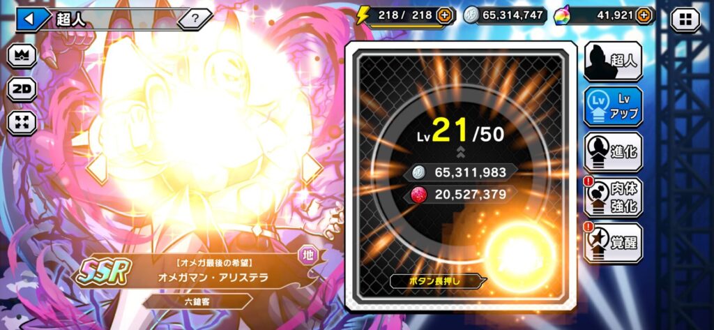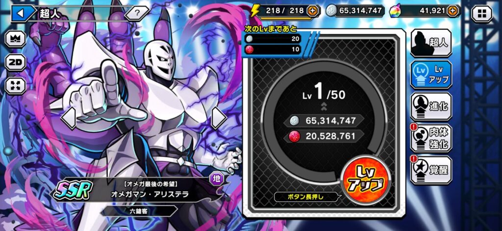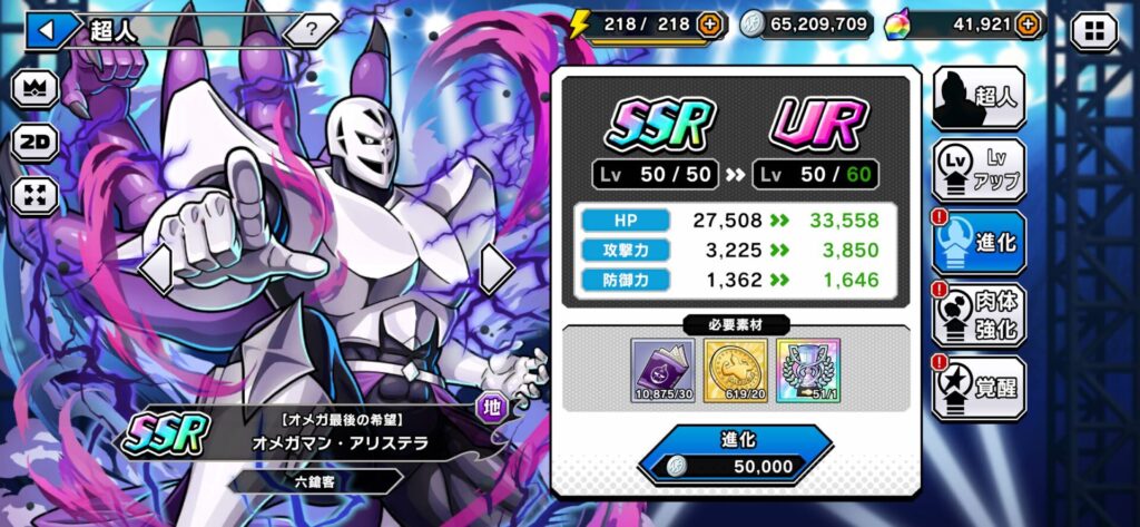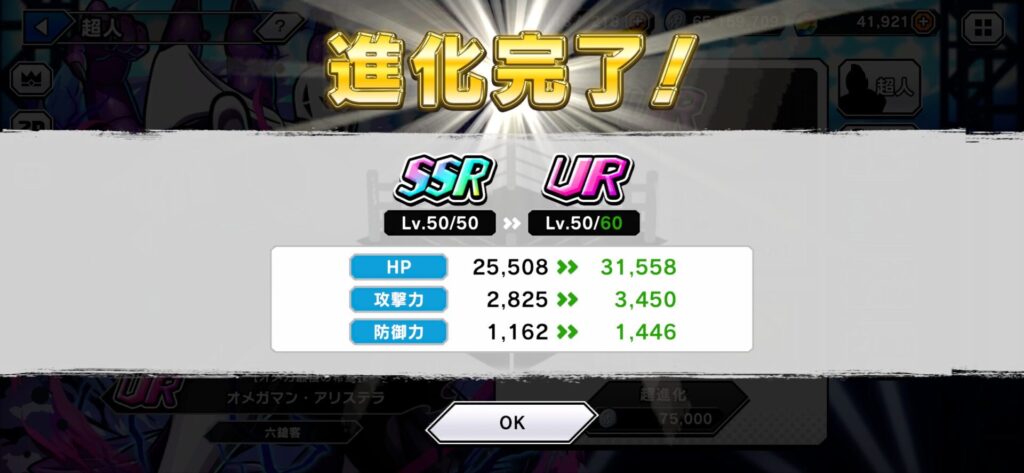 レベルアップで50まで育てた超人を進化させることで、レアリティがURへと変わりレベル上限も60となります。