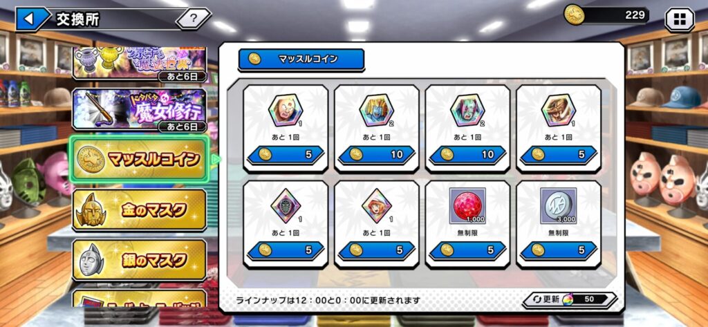 推しの超人の石が並んでいたら、マッスルコインを消費して交換することが可能です。