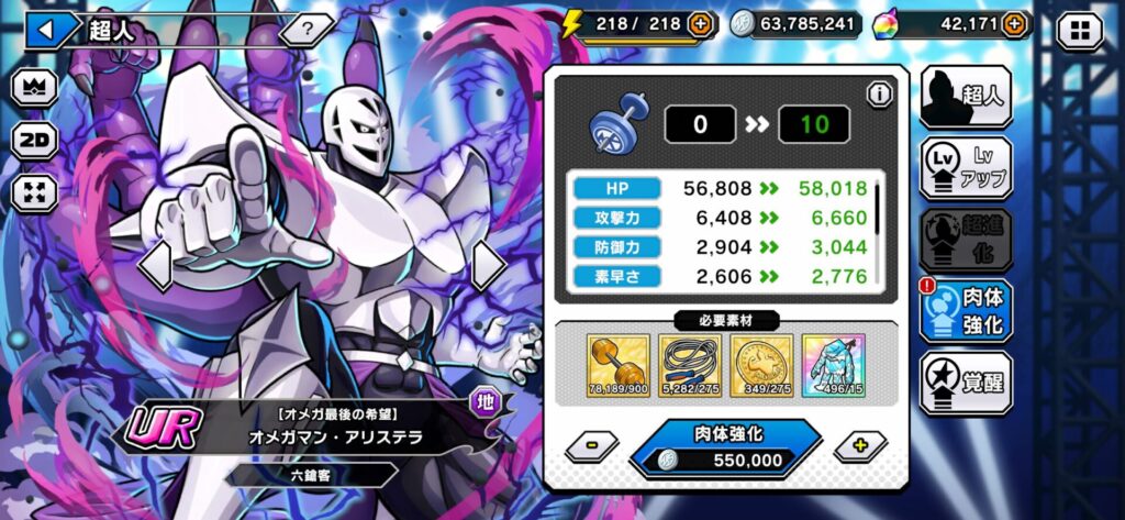 肉体強化はイベントやストーリーで入手できる素材を消費して、超人のステータスを少しずつ強化できるシステムです。