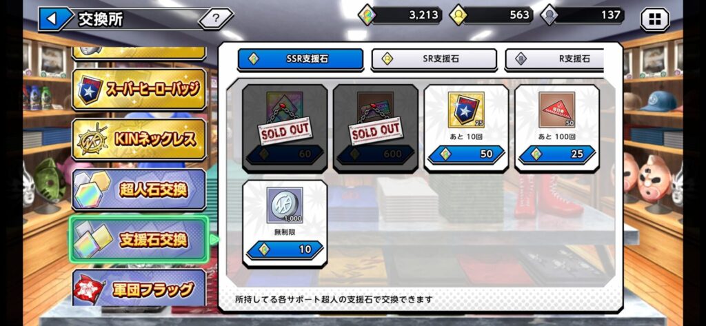 万能SSR支援石への変換は超人支援石60個につき10個となっています。