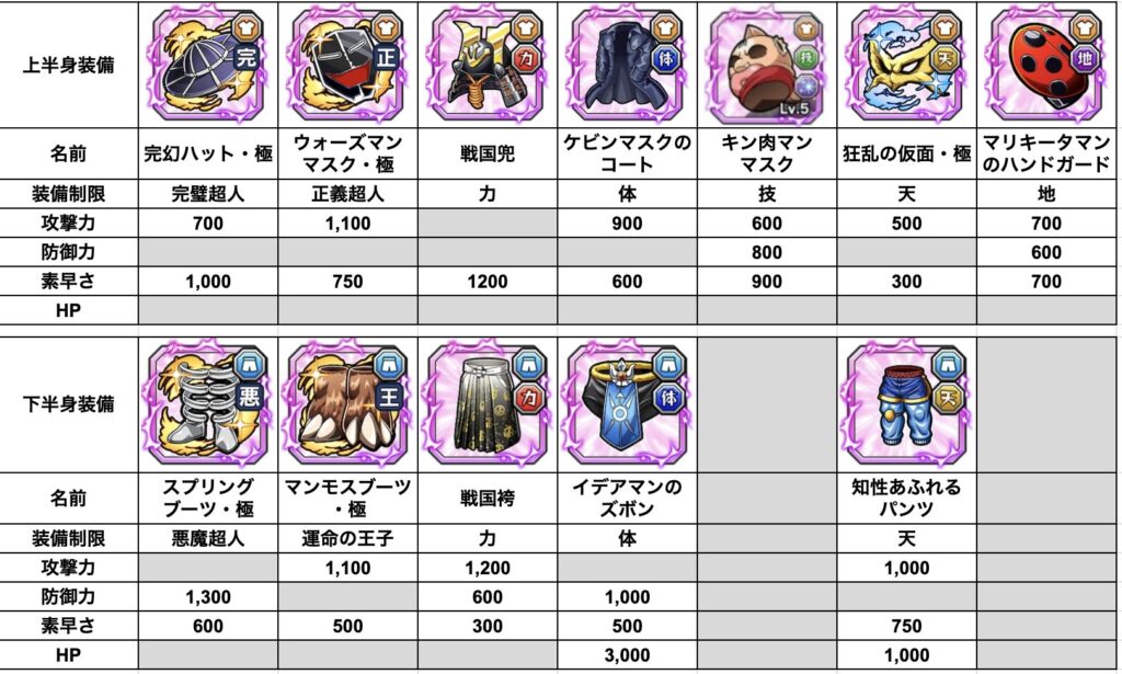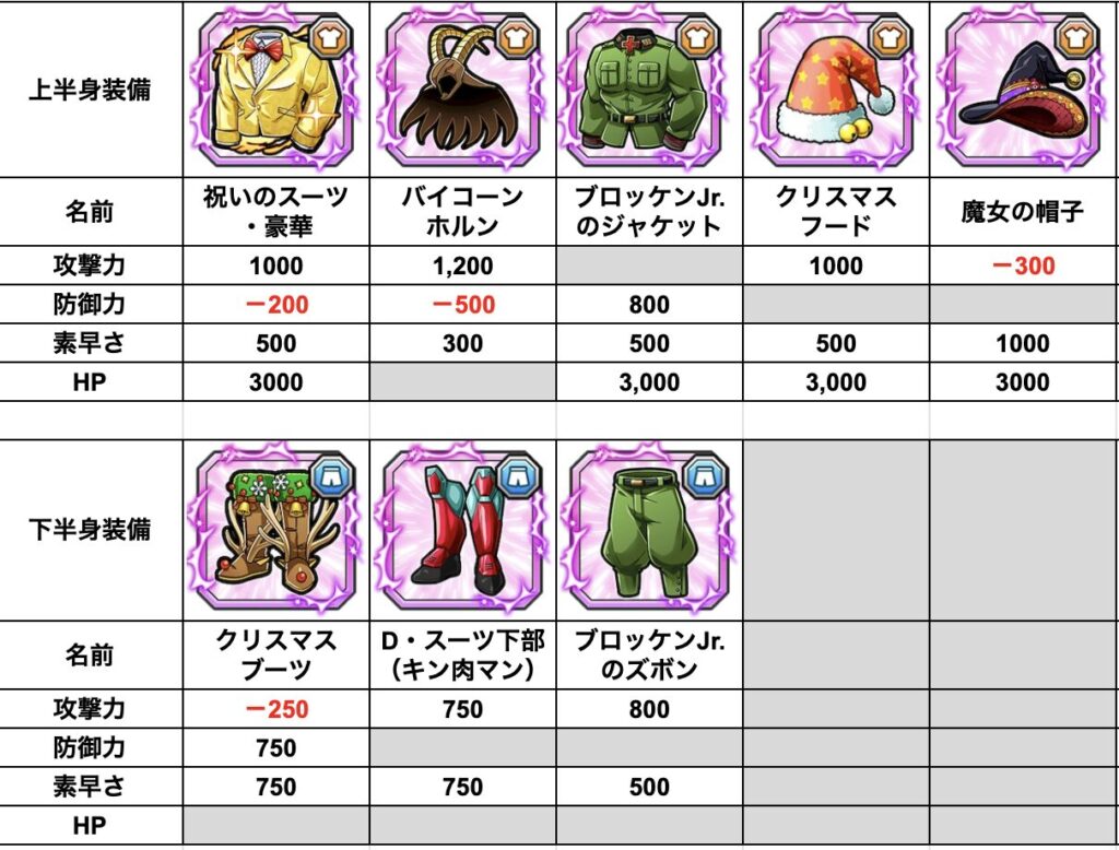 今までに登場した専用装備は、全てが攻撃or防御に加えて素早さが上昇するものとなっています。