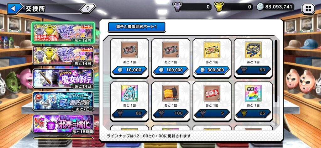 素材交換は毎日2回更新されるパート1と1回限りの交換となるパート2に分かれています。