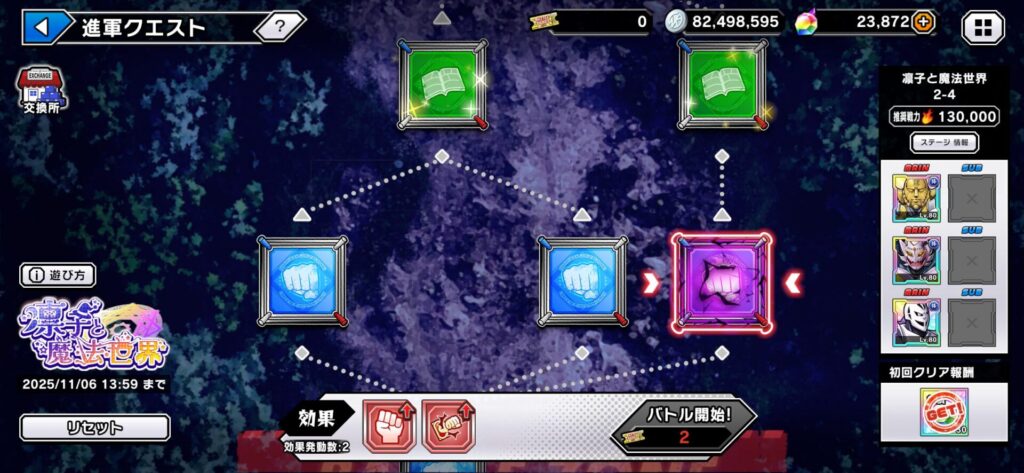例えば、右ルートの1マス目では「バトルチケット・レア」を2枚消費が必要であり、その後も進軍の度に「バトルチケット・レア」が要求されます。