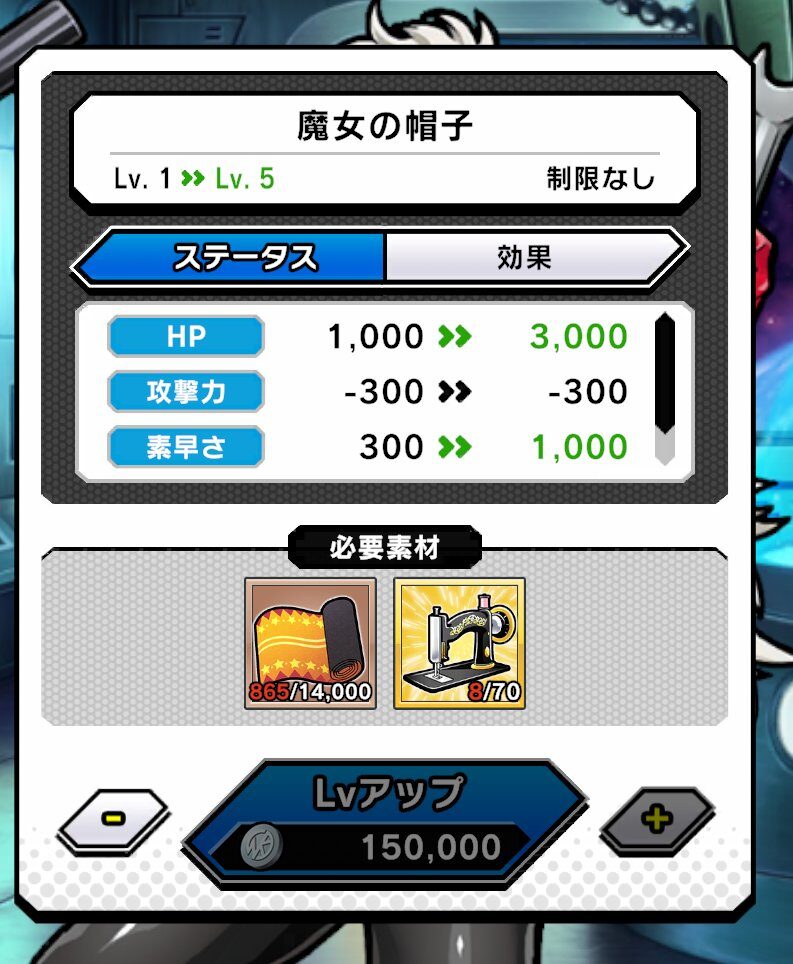 手に入れた魔女の帽子は、しゃれこうべエナジーなどでは強化できない特殊な装備。
