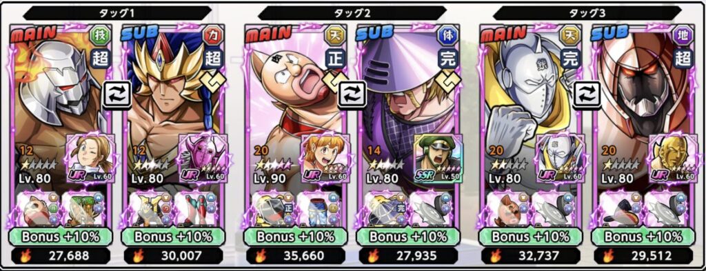 あとは全体攻撃2つ持ちの超人がいればそちらからチョイスするのもありですが、基本的には手持ちの超人から高火力アタッカーを選出しましょう。