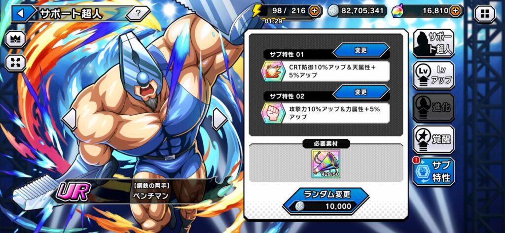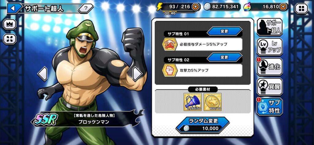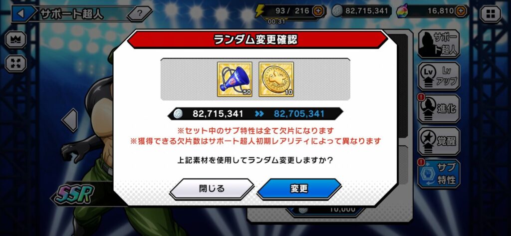 SSRサポート超人のサブ特性を任意のものにしたいときはランダム変更で1種類を引き当ててから任意のサブ特性を付けるのが効率的