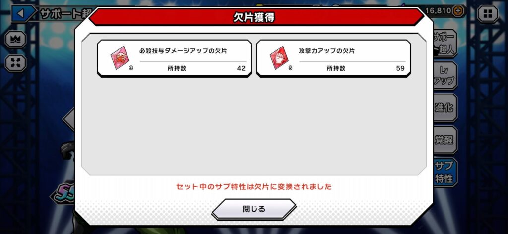 また、サブ特性変更時に入手可能なスキルの欠片はサポート超人の初期レアリティに依存するため、なるべくSRサポート超人を優先した方がスキルの欠片を集めやすくなっていますよ。(初期レアリティSR=3個、R=1個なので)