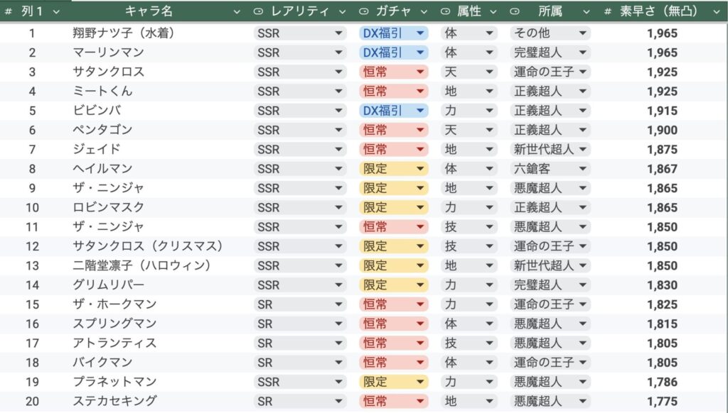 実装済み超人素早さランキング20位【属性別】