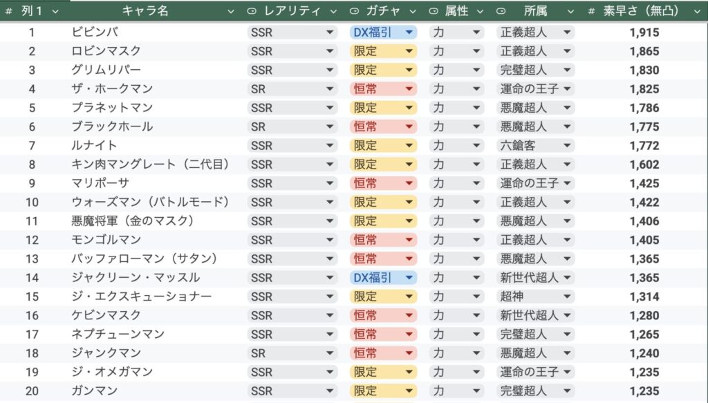 コロシアムのボーナス超人の中から出来るだけ素早さの高い超人を選ぶ際に活用してもらえたら嬉しいです。