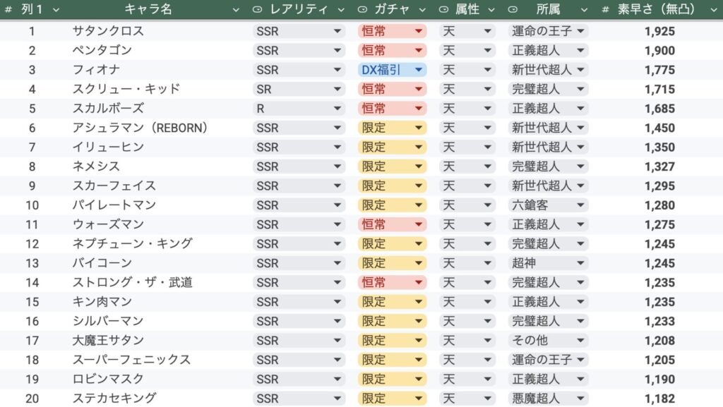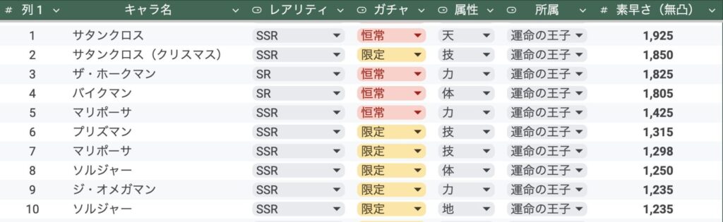 実装済み超人素早さランキング10位【所属別】正義・悪魔・完璧・運命