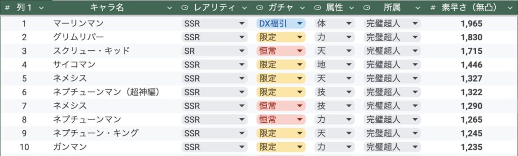 最近実装された中では、サイコマンとネプチューンマンがどちらもランクイン。とはいえ、3位以下はかなり足が遅くなります。
