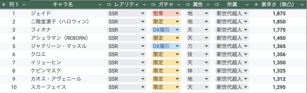 素早さは覚醒によっても上昇するため、無凸の上位超人よりもランキング上位の完凸SR超人の方が段階的には素早い場合も多々あります。