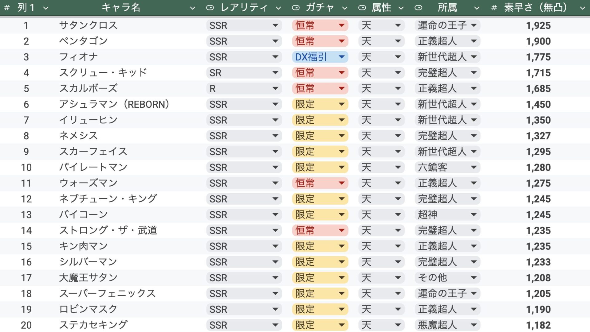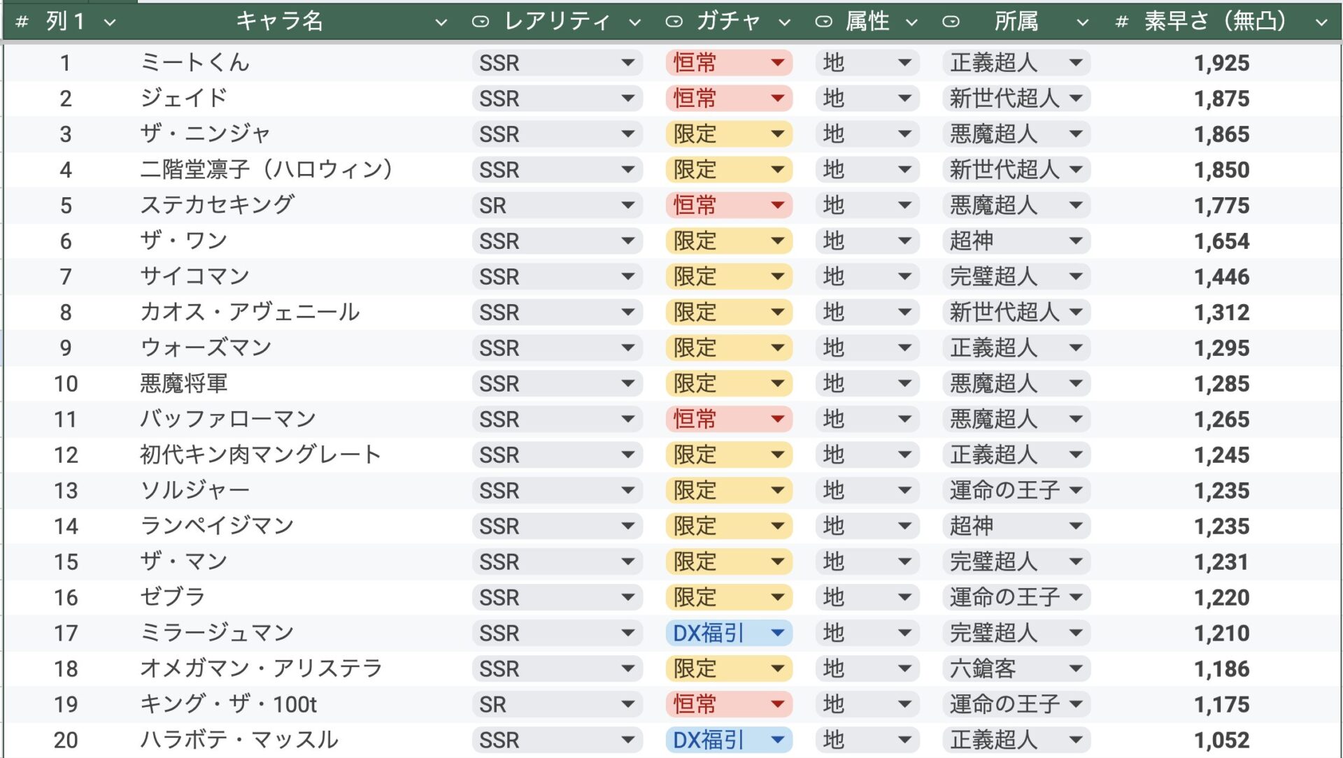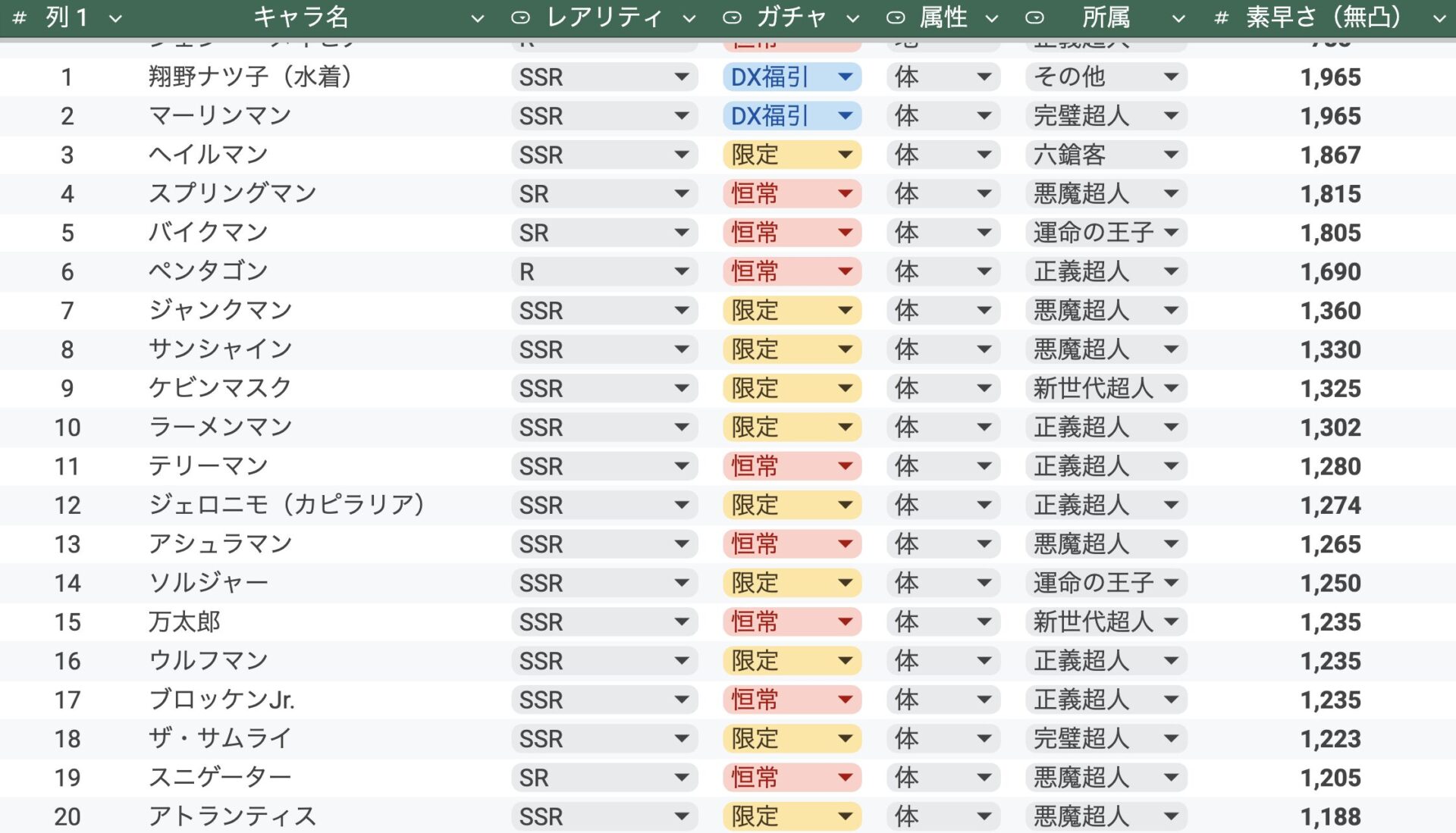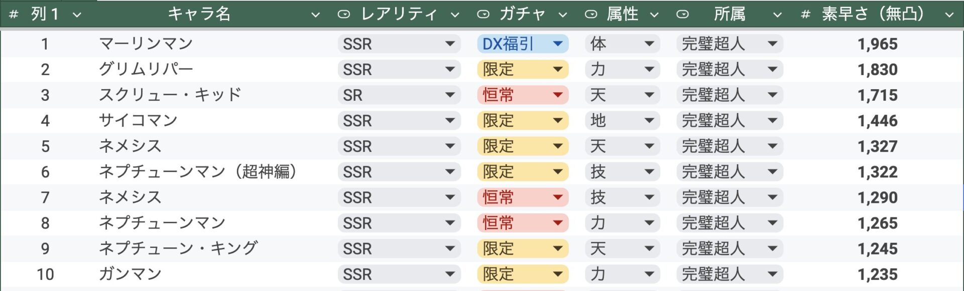 最近実装された中では、サイコマンとネプチューンマンがどちらもランクイン。とはいえ、3位以下はかなり足が遅くなります。