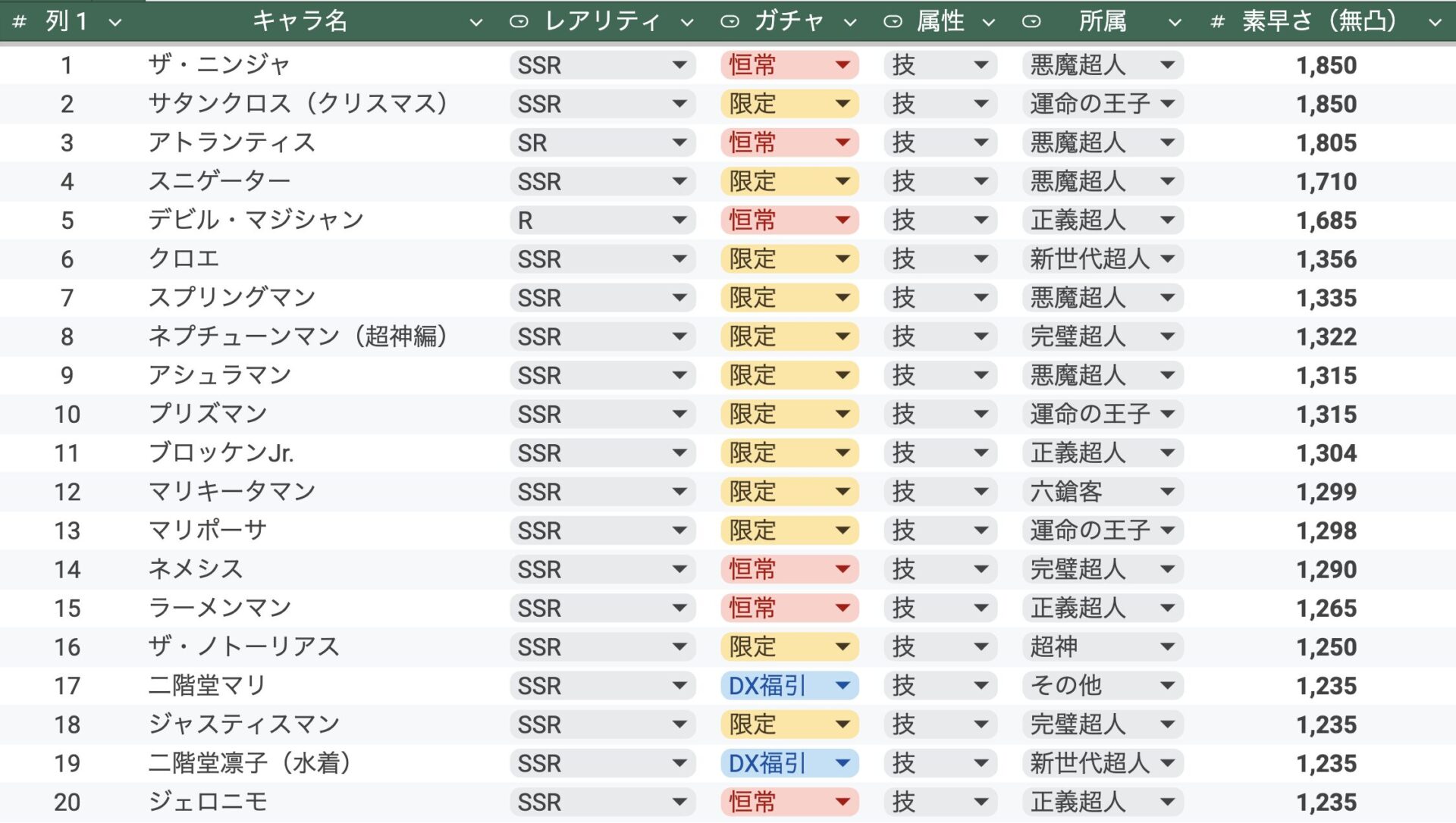 コロシアムのボーナス超人の中から出来るだけ素早さの高い超人を選ぶ際に活用してもらえたら嬉しいです。