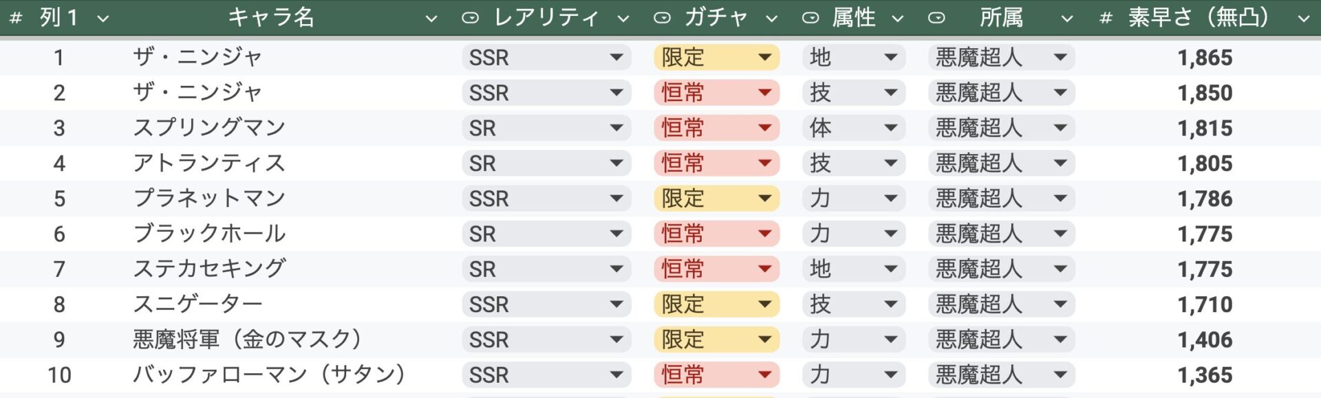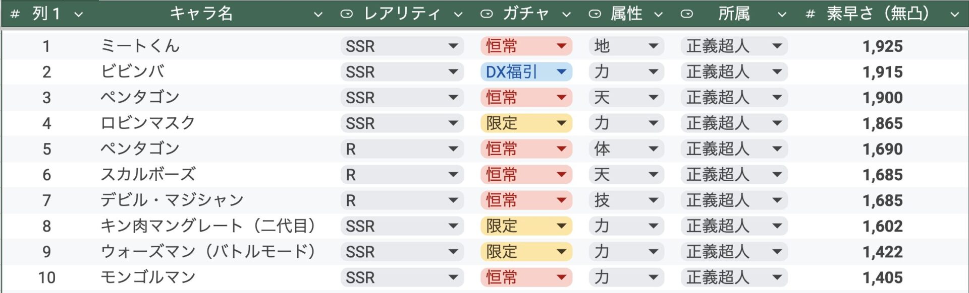 実装済み超人素早さランキング10位【所属別】正義・悪魔・完璧・運命
