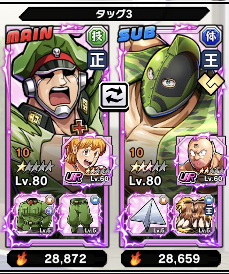 - メインにブロッケンJr.を配置・サブ位置に【業火の炎】ソルジャー(要3凸)を配置する